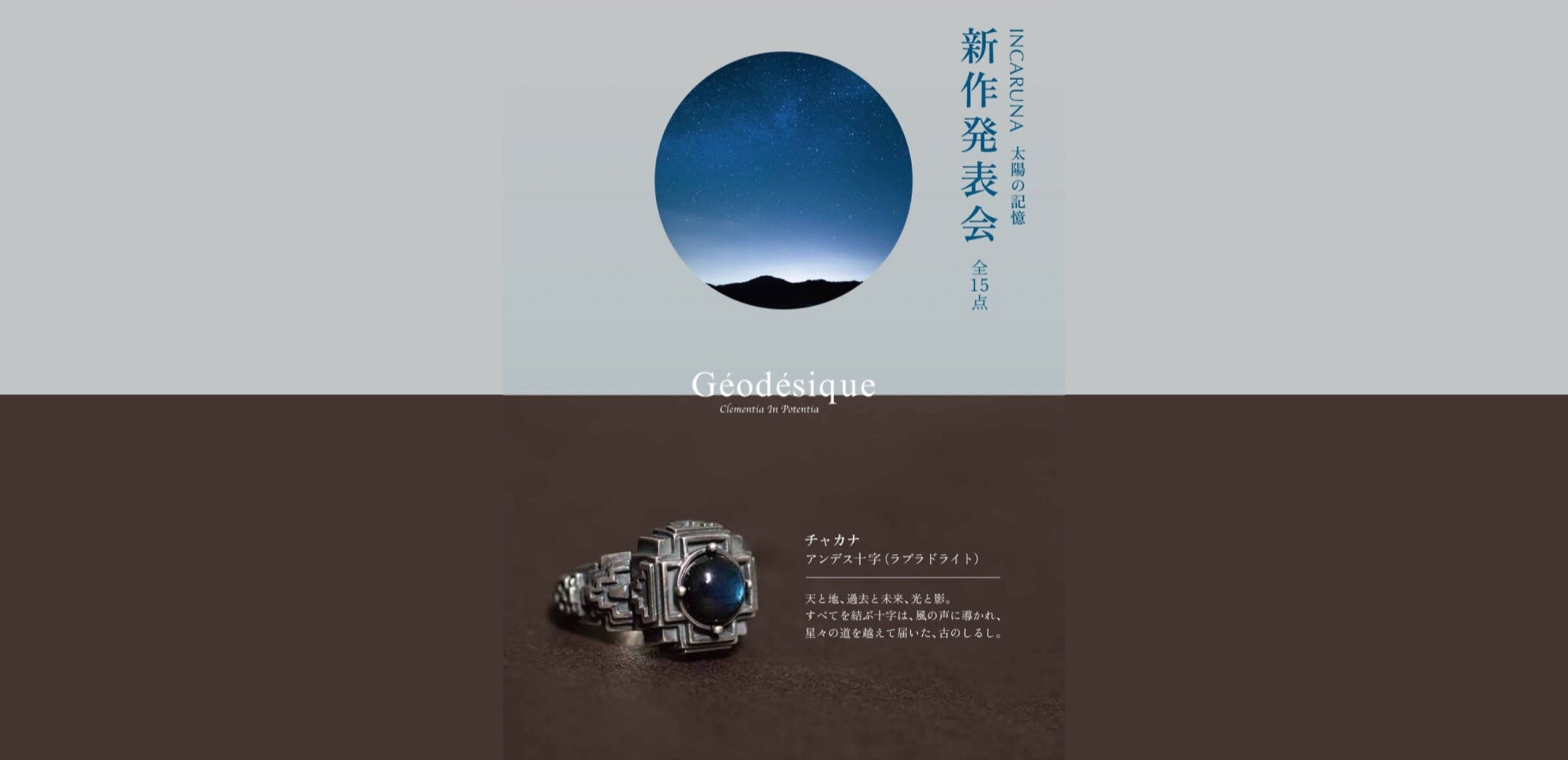 この秋の新作は、デザイナー中井先生がマチュピチュを訪れ、インカ文明の精神性や宇宙観に着想を得たコレクションとなっております。新作の他、300点におよぶコレクションをご覧いただけます。全日程、デザイナー在廊しておりますので、ぜひ店頭で、デザイナーの語るストーリーとともに、作品をご覧くださいませ。※期間中、お買い上げの方には、2つの素敵なノベルティをご用意しております。
