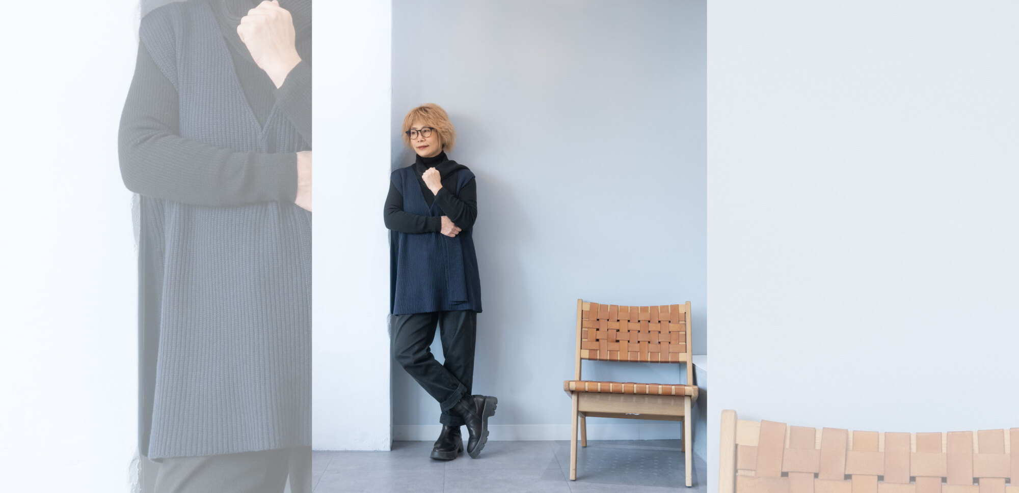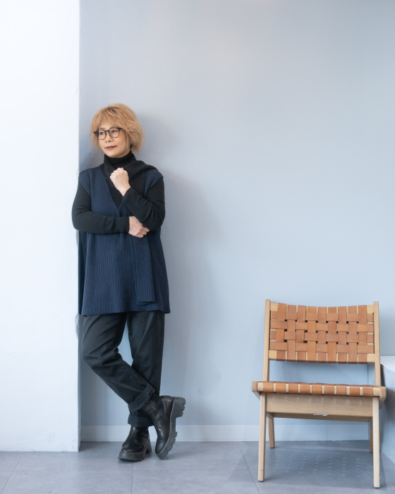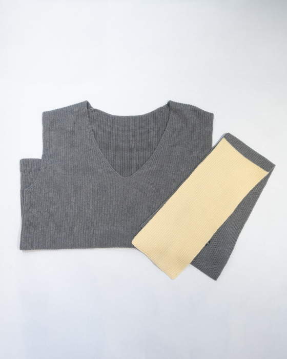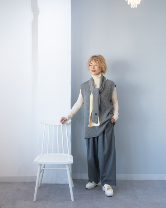 ヒップが隠れる嬉しい丈のベストは、ヒップラインも拾わず嬉しさ2倍。コットンカシミヤ素材で毛玉の心配もないから更に嬉しい。同素材のタイマフラーは、バイカラーでポイント使いにgood。ぜひセットでお楽しみください。店頭でぜひご覧くださいませ。