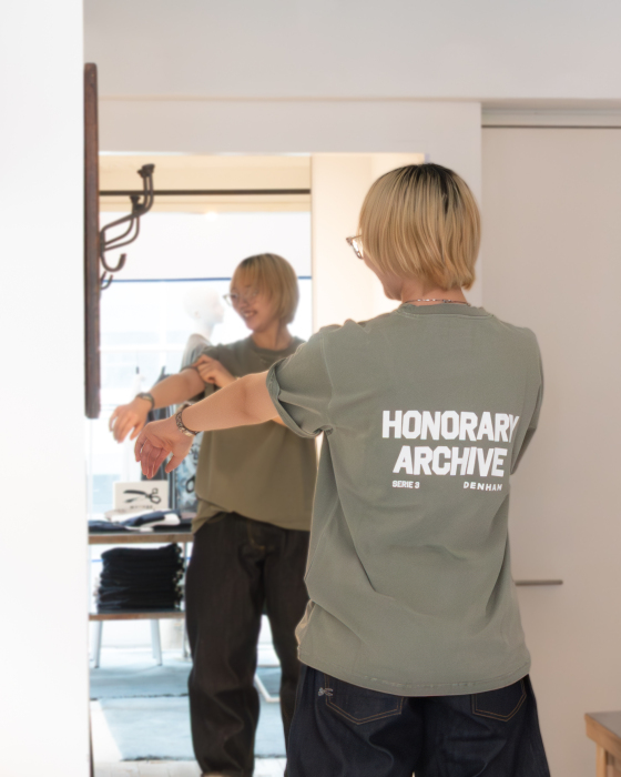 程よい厚みの生地にヴィンテージな風合い。白のバックプリントがシンプルなカーキ×インディゴコーデを大人っぽく格上げ!