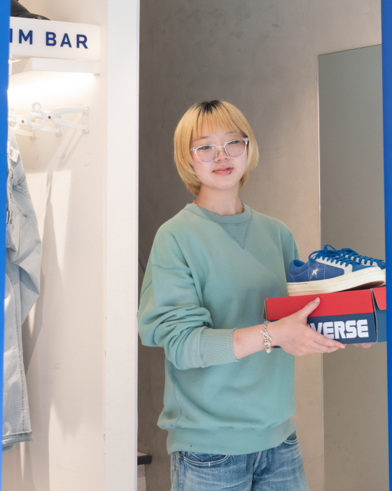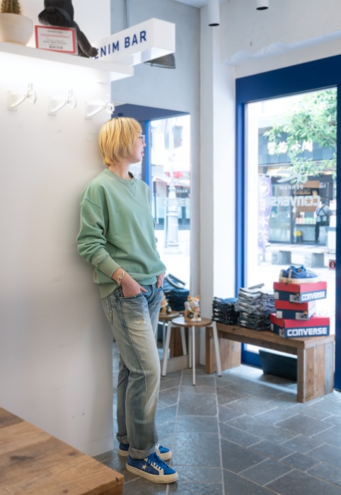 軽やかなコットン生地の薄手スウェットは着心地抜群で、これからの季節にぴったり。さりげないダメージ加工が、デニムとの相性をさらに良くしてくれる。大人の余裕を感じる、秋のコーデ。