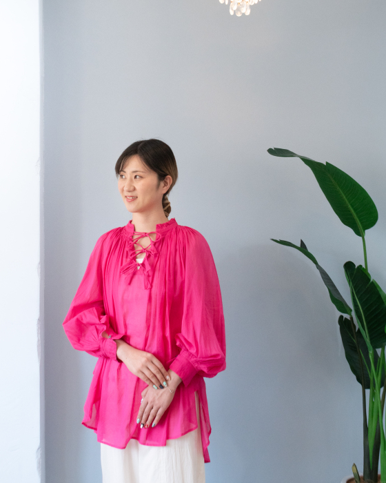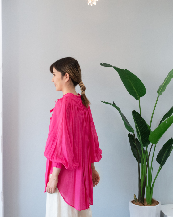 PLAIN PEOPLEのアンティークブラウスをイメージしたブラウス。生地を惜しみなく使ったふんわりしたシルエットが特徴的。袖口のタックや襟元の花びらのような布飾り。インドの手仕事ならではのテクニックが詰まった一枚。暑さに負けないビビッドピンク。白ボトムはもちろん、今年はブラウンとぜひ合わせてほしい。