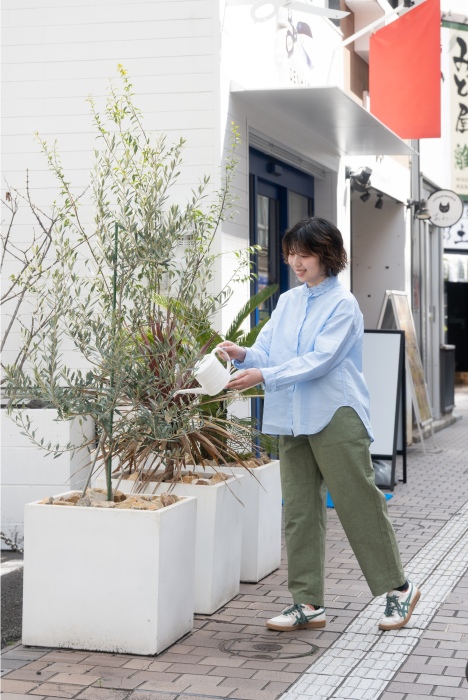 やっぱり好きな、王道コーデ。さりげないフリルのブルーシャツに、風合い豊かに染められたカーキパンツ。シンプルだけど、なんだかしっくりくる組み合わせ。