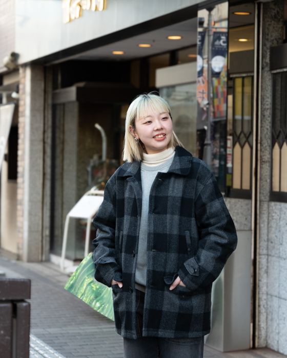 大柄チェックが存在感を放つハンティングジャケット。落ち着いたモノトーン配色で仕上げているため、クラシックな柄ながら都会的な印象で着こなせる一着です。