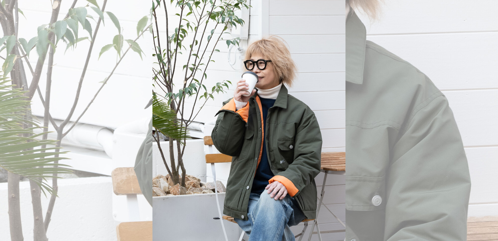 オリーブ×オレンジカラーのジャケット。寒い日はインナーにスウェットを着込んで。今日はゆったりストレートデニムでコーディネート。ラフなのに目が離せない「デンハムブランド」