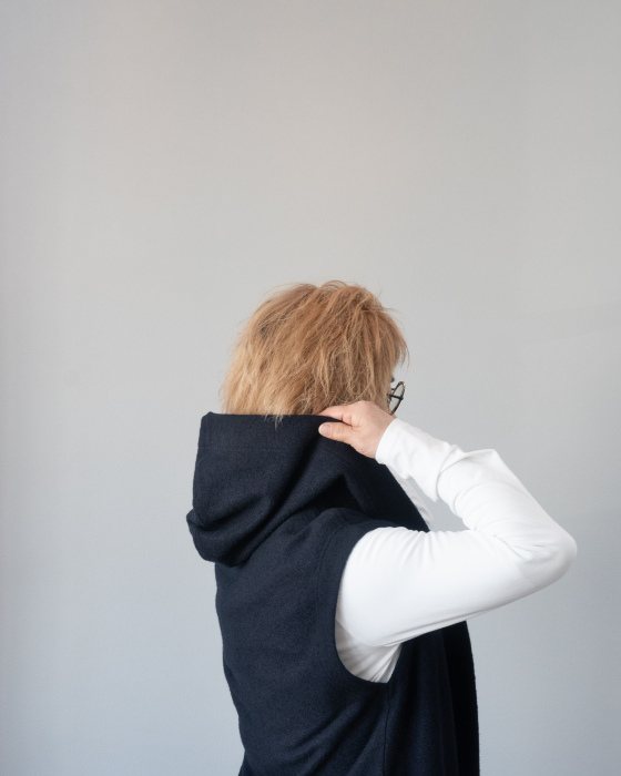 【ジレ / koyukiのフード付きウールジレ】寒い時には、コートインに着て、ライナー代わりにもなるジレ。フード付きなら首元の寒さ対策にも。フードがあるだけで、きちんとイメージのジレの印象も変わる。