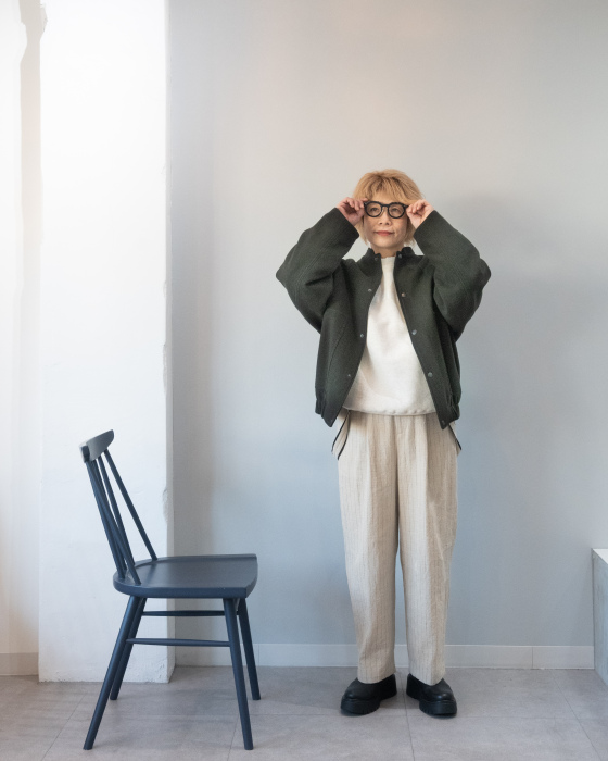 【bottom/ PLAIN PEOPLEのサスペンダー付きパンツ】洗いをかけたようなピンストライプ+テーパードシルエットで細見え間違いなしの一本。肉厚なリネンコットンの風合いがアウターとも好印象。計算されたプレインピープルのシルエット美と穿き心地、必見です。