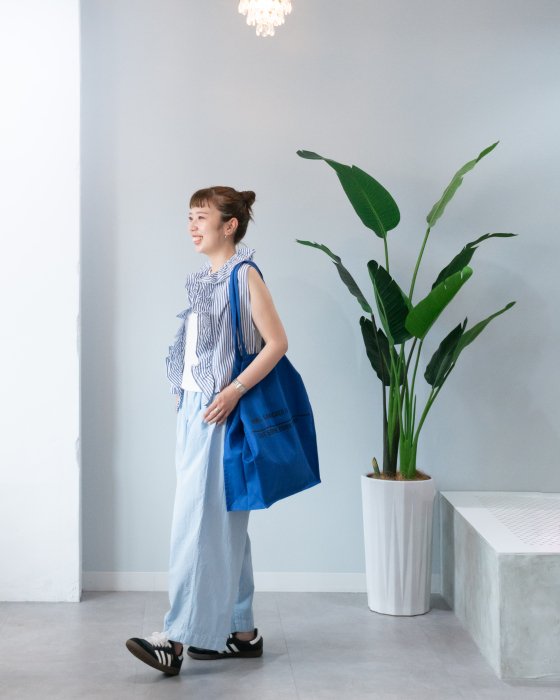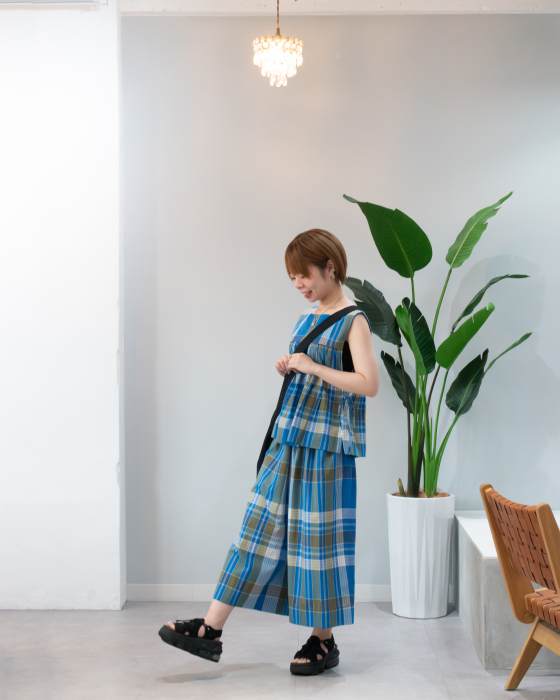 脇が開いていて、リボンで留めることもできるデザイン。身幅の広いアイテムや、タンクトップに合わせてもgood!ストライプは、ハリのある薄手のコットンブロード生地。アイボリーは、リネンのナチュラルな質感が魅力の生地。ぜひ、店頭にてご覧ください。