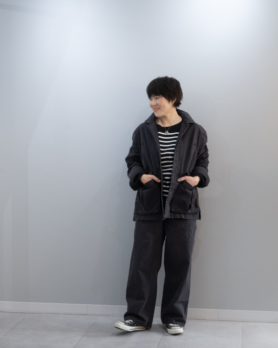 肩の力を抜いて、自然体で。着込むほどに風合いが増し、経年変化も楽しめるワークジャケット。日々の暮らしに寄り添いながら、自分だけの一着へと育っていきます。セットアップでもご着用頂けます。